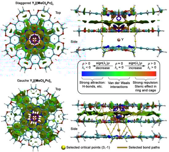 NCI plots for staggered and gauche conformations of Y2[(MeO)8Pc]3 with selected critical points (3,−1) corresponding to intramolecular interactions of methoxy-groups. The inset shows the qualitative dependence of the isosurface colour on the strength of the noncovalent interaction. For clarity, RDG isosurface is plotted only for the region between two Pc ligands.