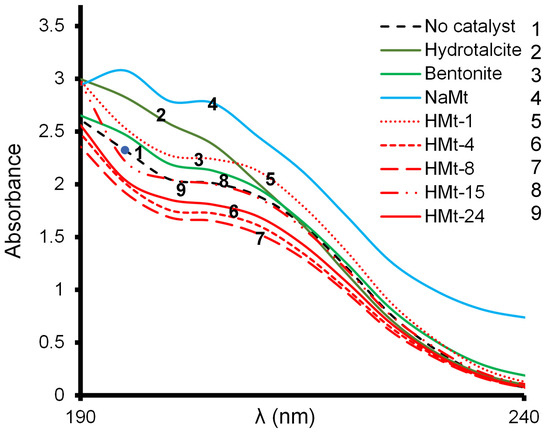 As compared to the ozonation of LA solution (Pattern 1-curve in dashed line), the addition of HMt-4, HMt-8 and HMt-24 induced a marked absorbance decrease (Pattern 6, 7 and 9), much less visible for HMt-15 (Pattern 8). This is a general tendency that can be explained by lactate anion depletion via protonation, LA dimerization and adsorption by non-electrostatic interaction as a result of lower pH (2.42–2.83) than LA pKa (3.86) induced in the LA solution by all cationic clay catalysts (Table 1).