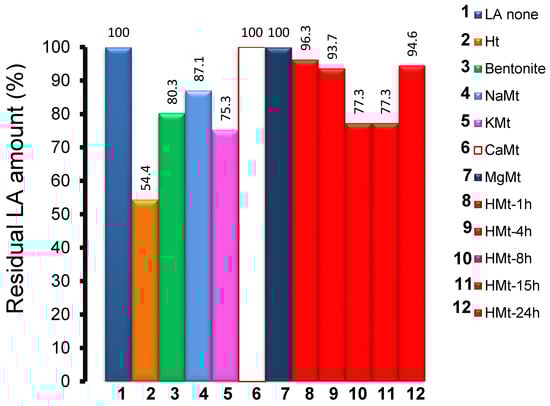 LA adsorption, if any, should involve clay–LA, LA–water and clay–water interactions with possible synergy and/or competitivity. LA adsorption on Ht after 3 min contact was reflected by lower LA residual amounts (LARA) of 54.4%, ca. 75.3% on KMt, 77.3% for both HMt-8 and HMt-15, 80.3% on bentonite, 87.1% on NaMt, 93.7% for HMt-4, 94.6% on HMt-24 and approximately 96.3% for HMt-1 (Figure 2). Almost no adsorption was registered on CaMt and MgMt, presumably due to a sandwiching effect of bivalent cations that favors clay aggregation via clay–clay interactions and reduces the accessible surface.