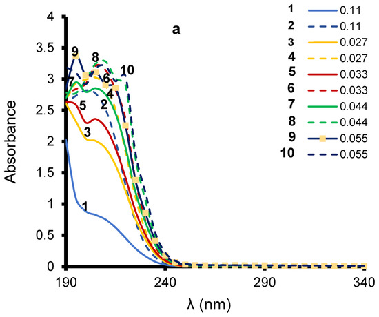The most intense band (195–200 nm) corresponds to the π→π* transition. This band shades LA degradation, often overlapping with those of early oxidized derivatives in the ozonation of many organic substrates [36,37,38,39,41,42,54]. The lower intensity shoulder appear at 210–215 nm, corresponding to the n→σ* transition, a specific feature of the carbonyl group in an aqueous solution. The barely detectable band observed at 265–290 nm was assigned to an n→π* transition of LA carboxyl.