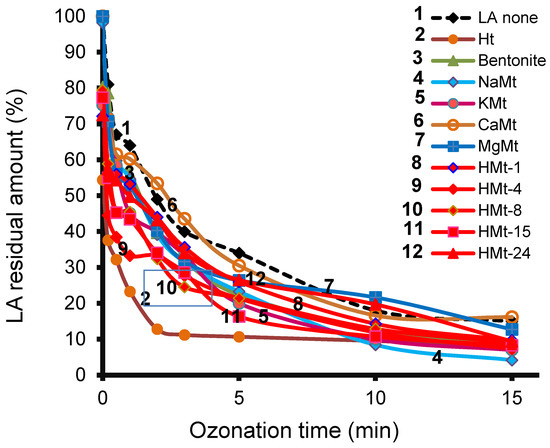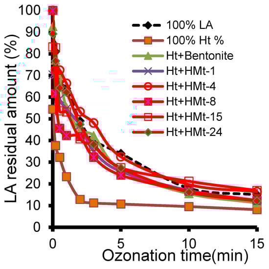 LA depletion in time during ozonation in the presence of 80–20% Ht-Mt mixture as determined by HPLC-UV. Since montmorillonite (Mt) is the preponderant clay mineral with expanded structure in bentonite and modified counterparts, the latter was denoted in this figure as Mt.