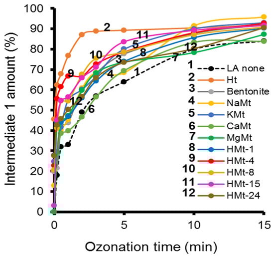 The increase in time of the Int-1 peak (Figure 5) took place simultaneously with LA depletion, and was more pronounced during the first three minutes of ozonation in the presence of all clay catalysts, and even faster with Ht (Figure 4).