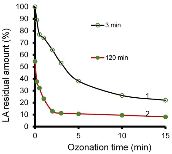 LA residual amount (%) during ozonation of Ht suspension after 3 min contact time under mild manual stirring (1) and 120 min under vigorous magnetic stirring (2). LA residual amount (LARA) was assessed with HPLC-UV in the centrifuged supernatant after 40 mg hydrotalcite immersion in 20 mL LA aqueous solution with a concentration of 2.5 g.L−1 (27.75 mM).