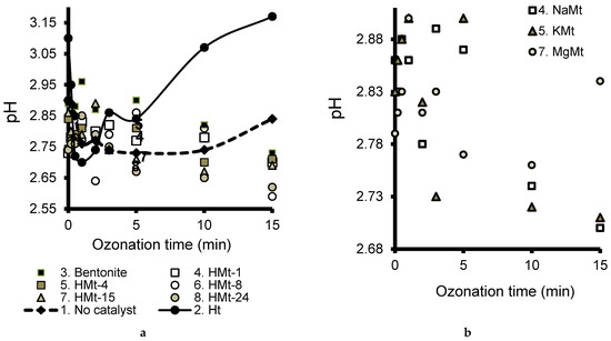 Starting from specific initial pH of LA solution (Table 1), all clay catalysts produced a marked pH decrease after 2 min ozonation (Figure 7). This pH decrease was continuous and progressively attenuated in time for all smectite-based catalysts. This stage is supposed to involve fast LA decomposition into acidic species such as pyruvic (pKa 2.45), acetic (pKa 4.75), oxalic (pKa1 1.25 and pKa2 4.3), formic (pKa 3.74) and carbonic (pKa1 6.35 and pKa2 10.32) acids. As compared to smectite catalysts, Ht produced a more pronounced pH decrease, but followed by an apparently paradoxical pH increase after 2 min LA ozonation (Figure 7a).