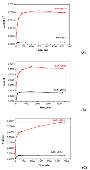 Solubility kinetic profiles of compounds I (A), II (B), and III (C) in buffer solutions (pH 2.0 and 7.4) at 298.15 K (dotted lines corresponds to equilibrium solubility).