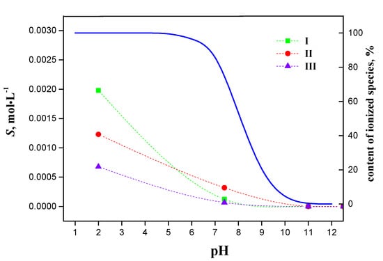 The differences in the solubility of the compounds under study depending on the buffer solution pH value are most probably associated with molecule ionization. The apparent ionization constants of hybrids I–III refined using the pDISOL-X software (Rev 3.093) developed by Avdeef [17,18] are identical and equal to 8.1. The studied compounds are weak bases capable of binding a proton to the lone pair of electrons of the nitrogen atom in the piperazine heterocycle. The content of the ionized hybrid forms in the aqueous solution, depending on the medium pH, is presented in Figure 4. Theoretically, all the studied compounds are completely ionized in the acidic medium (buffer pH 2.0). When the pH value of the medium increases to 7.4, the content of charged particles goes down to 80%. A direct consequence of this process is the reduction in the solubility values in the phosphate buffer pH 7.4 for all the studied compounds. Figure 4 also shows the experimental points corresponding to the solubility of the studied compounds in the selected buffer solutions at T = 298.15 K. The obtained pH dependences are smooth asymptotically decreasing curves, which are typical for weak bases.