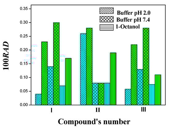 The comparison of fitting by two thermodynamic models in terms of the RAD for the whole of the experimental measurements graphically presented in Figure 5. It is obvious that for all the studied systems (except compound II in buffer pH 7.4), the modified Apelblat equation gives more accurate results. The maximum value of 100RAD is 0.26 for the Apelblat model and 0.30 for the van’t Hoff equation, whereas the average values are equal to 0.10 and 0.21, respectively.