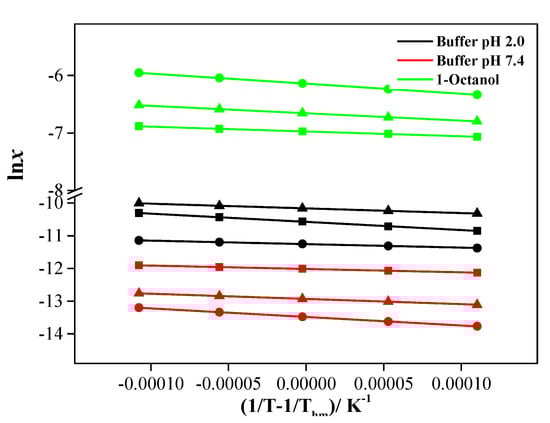 The dissolution of the new hybrids was characterized based on apparent thermodynamic parameters obtained from temperature dependences of solubility of the studied compounds in the selected solvents (Figure 6). As Figure 5 shows, in all systems studied, there is a good linear dependence of the experimental solubility values on temperature within the whole range (R ≥ 0.9994). The van’t Hoff enthalpy of dissolution can be expressed as the inclination of a tangent to a solubility curve plotted as lnx vs. (1/T − 1/Thm) by Equation (6):