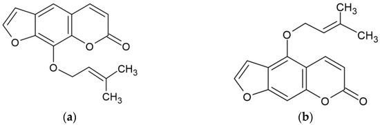 The structures of (a) imperatorin (CAS 482-44-0) and (b) isoimperatorin (482-45-1).