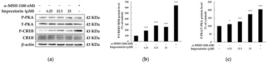 α-MSH, which is a hormone that is involved in the first stage of melanogenesis, stimulates phosphorylation of protein kinase A (PKA) and cyclic adenosine monophosphate (cAMP) response element-binding protein (CREB) in melanocytes, thus inducing the synthesis of the downregulating proteins that are associated with melanogenesis [31,32,33,34]. Therefore, we next examined whether imperatorin induces melanogenesis via the PKA/CREB signaling pathway in B16F10 cells. As a result, we confirmed that phosphorylation of PKA and CREB is significantly increased when B16F10 cells are stimulated with imperatorin in a dose-dependent manner (Figure 5). When taken together, these data show that the melanogenesis effects of imperatorin closely involve the PKA/CREB signaling pathway and occur after the upregulation of TYR, TYRP-1, and TYRP-2 via MITF.