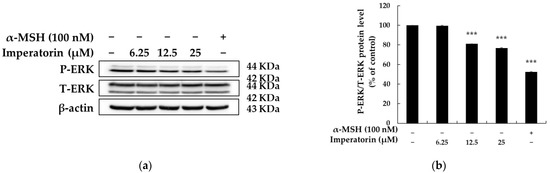 In addition to PKA/CREB signaling, the MAPK family (which includes ERK, JNK and p38) is known to play an important role in the regulation of melanin production. The activation of ERK is associated with a reduction in MITF degradation and pigmentation, while the inhibition of ERK increases melanin synthesis. Thus, MAPK signals in melanocytes are promising targets for the development of cosmetics and treatments for skin pigmentation through which MITF expression and stability can be increased [35,36,37]. Therefore, we evaluated the effectiveness of imperatorin for the inhibition of the ERK signaling pathway to further explore the molecular mechanisms of melanin synthesis in B16F10 cells. As shown in Figure 6, imperatorin reduced the ERK phosphorylation concentration in a concentration-dependent manner. Therefore, it could be concluded that the inhibition of ERK phosphorylation by imperatorin is one of the basic mechanisms that induced pigmentation.