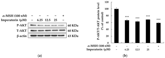 The effects on the protein expression of AKT in B16F10 melanoma cells when the cells were treated with imperatorin (25, 12.5 and 6.25 μM) for 4 h: (a) Western blotting results; (b) protein levels of MITF. β-Actin was used as a loading control. The results are presented as the mean ± SD from three independent measurements using ImageJ software. *** p < 0.001 vs. the untreated control group.