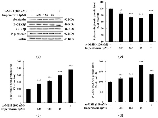 The effects on the protein expression of β-catenin, P-GSK3B, and P-β-catenin in B16F10 melanoma cells when the cells were treated with imperatorin (25, 12.5, and 6.25 μM) for 24 h: (a) Western blotting results; protein levels of (b) P-β-catenin, (c) β-catenin, and (d) P-GSK3β. β-Actin was used as a loading control. The results are presented as the mean ± SD from three independent measurements using ImageJ software. ** p < 0.01 and *** p < 0.001 vs. the untreated control group.