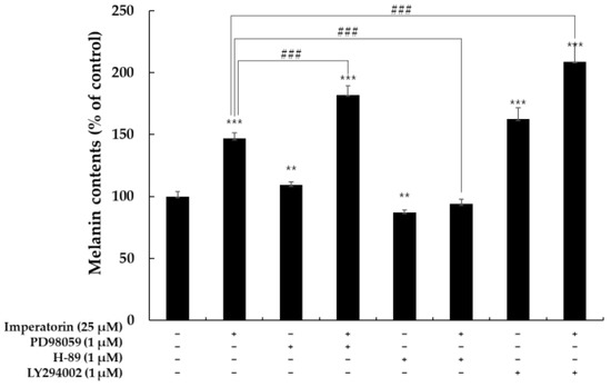 To further confirm the role of the signal pathways in imperatorin-induced melanin synthesis, we used the specific inhibitors ERK inhibitor (PD98059), PKA inhibitor (H-89), and AKT inhibitor (LY294002). Cells were pretreated with specific inhibitors 1 h before the addition of imperatorin, then incubated for 72 h for the measurement of melanin content. As shown in Figure 9, imperatorin treatment increased melanin content; these effects were remarkably activated by PD98059 and LY294002. On the other hand, simultaneous treatment of H-89 and Imperatorin slightly increased melanin content than Imperatorin alone. These results indicate that ERK-PKA-AKT-mediated signaling is essential for melanin production increased by imperatorin.