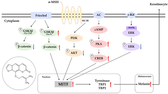 Another important signaling pathway that involves PI3K/AKT/GSK3β has been found to regulate the transcriptional activity of MITF. In fact, α-MSH-induced cAMP can inhibit AKT activity by inhibiting the phosphorylation of AKT in Thr308 and Ser473 via a PI3K-dependent mechanism. Thus, non-phosphorylated GSK3β, which is a downstream molecule of AKT, activates and phosphorylates MITF in Ser289 and upregulates the tyrosinase family genes, which results in melanin production. For example, the inhibition of phosphatidylinositol 3-kinase (PI3K) and downstream AKT signaling increases tyrosinase expression and melanin content, whereas the constitutive activation of AKT decreases melanin content. In this study, imperatorin decreased AKT activity and AKT phosphorylation in Thr308 and Ser473, followed by the inhibition of GSK3β phosphorylation. Among other effects, this GSK3β activation led to the activation of MITF and the increased expression of tyrosinase.