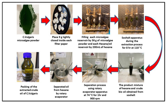 At the end of the extraction time (8 h), the hexane/oil mixture is collected from the hexane/oil reservoir, kept in the flask, and then sent to the rotary evaporator to separate the hexane from the crude oil of Chlorella Vulgaris microalgae. In the rotary evaporator apparatus, the hexane and oil mixture are placed in the reservoir of the hexane and oil and then heated to 74 °C to remove the hexane to another reservoir (the hexane reservoir), where the vaporized hexane passes through a condenser so that it can be recovered in the hexane reservoir [40]. Figure 1 shows the experimental stages of the extraction process in this study.