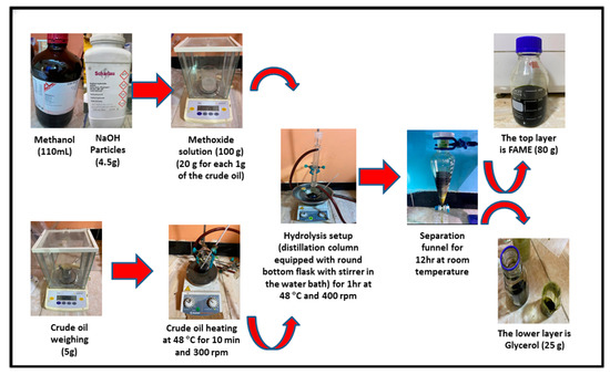This mixture was placed in the round bottom flask and heated to 48 °C for 1 h with stirring at 400 rpm [41]. After the temperature of the flask decreased to room temperature, the mixture was neutralized to PH = 7 using diluted sulfuric acid H2SO4 (1 M), and then sent to the separating funnel for 10 h. Two layers were formed in the separating funnel. The upper layer was FAMEs, and the lower layer was glycerol. Figure 2 shows the detailed experimental procedure to convert 5 g of the crude oil of Chlorella Vulgaris microalgae to FAMEs.