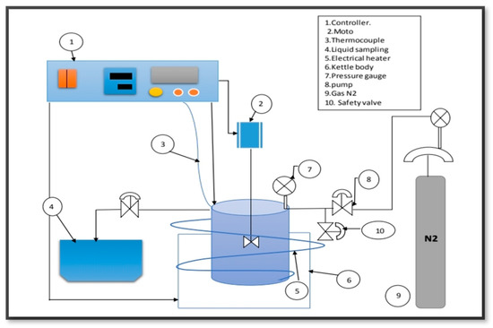 In a 100 mL stirring batch reactor (Zhengzhou Keda Machinery and Instrument Co., Zhengzhou, China) (ZZKD), the algae (HO) were catalytically deoxygenated as shown in Figure 3. The algal HO of 23.60 g was mixed with 3.54 g of the catalyst. The mixture was then poured into the reactor. To displace the air, the reactor was closed and squeezed three times with 5 bar of nitrogen (N2). The initial N2 pressure was then squeezed to 7 bar and retained in the reactor. The reactor was then heated to 300 °C and maintained at that temperature for 6 h, with the impeller rotating at 1000 rpm. The mixes were allowed to cool to room temperature when the reaction was completed. The gaseous phase was released (not studied). Filtration was used to separate the catalyst from the liquid phase.