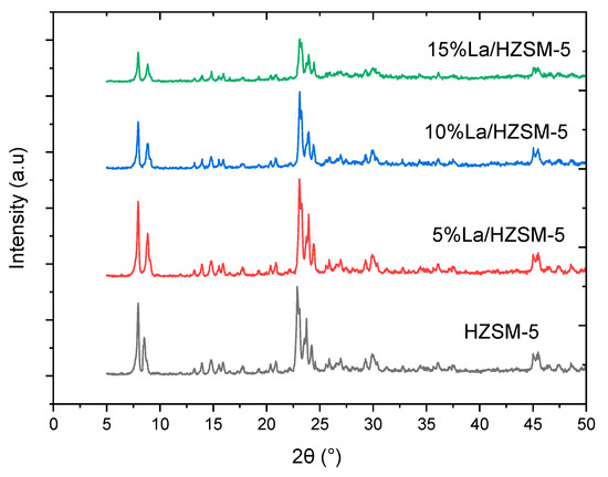 The XRD patterns of 5%La/HZSM-5, 10%La/HZSM-5, and 15%La/HZSM-5 are similar to those of the parent HZSM-5 in the peak positions and shapes, which also indicates that the lanthanum-modified HZSM-5 zeolites have a typical MFI (Mobil fifth) structure [52]. As a consequence, no impurity peaks were found based on the XRD data, and crystalline phases of lanthanum oxides are not detected in the XRD patterns, which indicates that lanthanum oxides may present either as amorphous and highly disperse on the external surfaces of HZSM-5 or penetrate the channels of HZSM-5 as much smaller species [28,52].