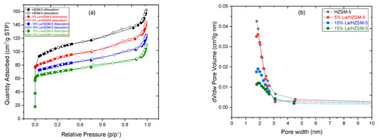 As shown in Figure 5a, based on the IUPAC classification, N2 adsorption–desorption isotherms of the lanthanum-modified zeolite catalysts were found to be of type I isotherms with an H3 hysteresis loop at a high P/P0 region, which is typical of micropore and mesoporous samples [34,60], which is similar to those of the HZSM-5. Moreover, by increasing the lanthanum-loading-weight percentage on the parent HZSM-5 catalyst, the N2 adsorption decreased with the relative pressure in the whole pressure range (P/P0).
