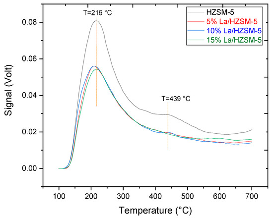 The peak areas indicated the number of acid sites, and the peak temperature ascribes the acid strength [28] as presented in Figure 6 [35]. In addition, Figure 6 shows that, for all the synthesized lanthanum-modified HZSM-5 zeolite catalysts compared with the parent HZSM-5, when lanthanum loading (wt.%) on the parent HZSM-5 increases, the amount and strength of all the weak and strong acid sites decrease to a different degree, thus, decreasing the total acidity. This is consistent with the results of previous researchers who explained that the modification of zeolites with metals changes the total acidity of the parent zeolite [34,71,72].