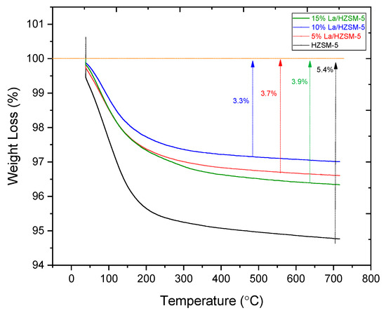 In this study, thermogravimetric analysis (TGA) was utilized to estimate the quantity of carbon that would fill the pores of freshly synthesized catalysts employed in the catalytic deoxygenation process in this study [80]. Figure 7 shows the thermogravimetric analysis (TGA) results for all the fresh synthesized catalysts. It can be observed that the total mass loss for HZSM-5 is 5.40%, while 3.70%, 3.30%, and 3.90% for 5%La/HZSM-5, 10%La/HZSM-5, and 15%La/HZSM-5, respectively, which is apparently due to the release of water from narrow channels [81,82], particularly in the range of (30–170 °C), which was accompanied by water removal from the fresh samples [83]. In conclusion, the addition of lanthanum to the HZSM-5 catalyst decreases the formation ability of coke deposits compared with the parent HZSM-5. The lowest mass loss was on the 10%La/HZSM-5.