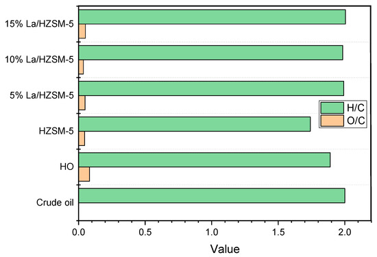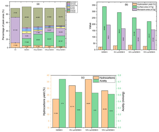 The use of rare earth metals to impregnate HZSM-5 improves the catalyst’s thermal stability [29,30]. Furthermore, the exchange of rare earth metal ions in the zeolite framework has aided hydrogen atom transfer, which manipulates hydrocarbon production at the expense of the oxygenated compound yield. To the best of our knowledge, there is no extensive study in the literature on the influence of La/HZSM-5 on algal HO catalytic deoxygenation upgrading. Furthermore, the majority of the literature on altering HZSM-5 with lanthanum has focused on model compound catalytic cracking processes (alcohol [31,32,33], methyl mercaptan [34,35], alkane [36], pyrolysis of bio-mass [37,38], and furans [39]) over La/HZSM-5 catalysts instead of algal HO (FAMEs) as a reactant.