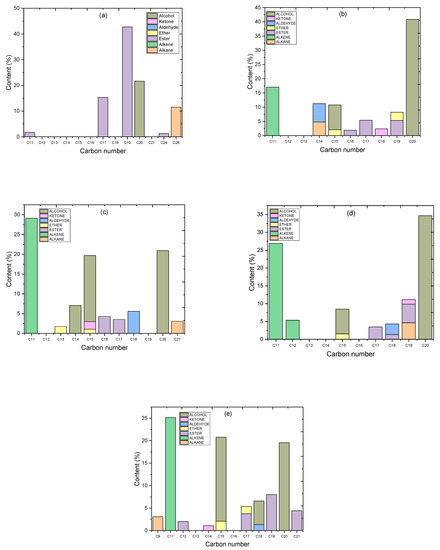 The National Institute of Standards and Testing (NIST) standard mass spectrum library was utilized to identify the product chemicals from GC–MS. The peak area percentage of the GC–MS chromatogram, which may also be expressed as yield percentage, can be used to compute the relative fraction of product chemicals [44], which was shown to be Equation (1). The conversion percentage for the algal HO was calculated using Equation (2) [45], with the same method described by Katikaneni et al. [46]. The average content (wt%) of X (X = C, H, and O) was calculated by Equation (3) [47]. The higher heating value (HHV) of the product was calculated using Equation (4) [47,48]. Equation (5) is used to compute the degree of deoxygenation (DOD%) [49].