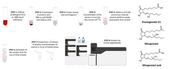 Scheme of biological samples preparation and analysis by developed UHPLC-QqQ-MS/MS as well as chemical structures of prostaglandin E1, misoprostol (synthetic PGE1 analogue) and its main metabolite–misoprostol acid.