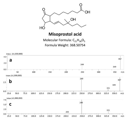 - Zou, Y.; Chen, X.; Song, B.; Zhong, D. Determination of misoprostol acid in human plasma by liquid chromatography coupled to tandem mass spectrometry. J. Chromatogr. B Analyt. Technol. Biomed. Life Sci. 2007, 852, 122–127. [Google Scholar] [CrossRef]
