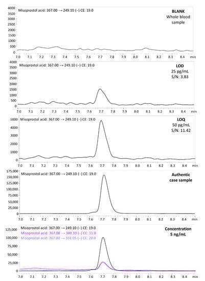 Chromatograms of the blank whole blood sample; misoprostol acid in blood at a concentration of LOD (25 pg/mL); misoprostol acid in blood at a concentration of LOQ (50 pg/mL); chromatogram of authentic placenta sample (Case 2); and misoprostol acid in whole blood at the concentration of 5 ng/mL (with all monitored MRM transitions).