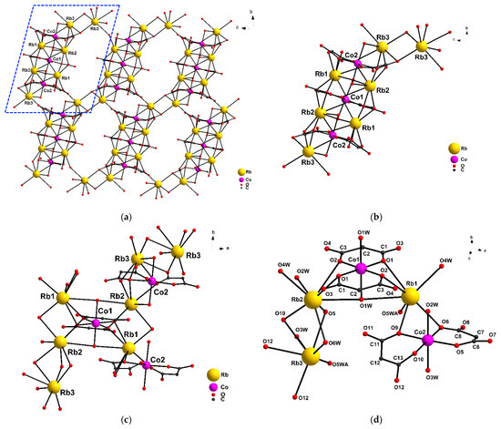 The {Co2(cpdc)2(H2O)2}2− moiety occupies a general position. The cpdc2− dianion also involved in the formation of the {Co2/O5/C6/C7/C8/O6} 6-membered ring has a κ2,μ4-type coordination mode and is bound to the all types of Rb atoms (Figure S2.1, Co2-O(cpdc2−) 2.027(3)-2.056(3) Å, Rb1-O6 2.884(3) Å, Rb2-O5 3.034(3) Å, Rb3-O5 3.222(3) Å), while the second cpdc2− dianion in the {Co2/O9/C11/C12/C13/O10} cycle has a κ2,μ5-type coordination (Co2-O(cpdc2−) 2.036(2)-2.056(3) Å, Rb1-O9 2.895(3) Å, Rb2-O10 2.995(2) Å, Rb3-O10 2.979(2)Å, Rb3-O12 2.897(3)Å). Due to the large number of water molecules coordinated to rubidium atoms, a framework is formed (Figure 1a). The coordination spheres of the Co atoms are complemented by two µ3-H2O (Co1-O1W 2.127(2) Å) or two µ2-H2O (Co2-O(H2O) 2.138(3), 2.145(3) Å) molecules to form a distorted octahedral geometry (SQ(Co1) = 0.060, SQ(Co2) = 0.152) [30]. The Rb atoms in 1 are in three structurally non-equivalent positions. The coordination environment of the Rb atoms is formed by O atoms of the cpdc2− dianion and water molecules and corresponds to a capped octahedron for Rb1 (RbO7), biaugmented trigonal prism for Rb2 (RbO8), and capped trigonal prism for Rb3 (RbO7) [30]. The main interatomic distances are indicated in Table S1.