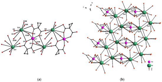 Replacement of Rb atoms with Cs leads to a decrease in the dimensionality of the polymer form from 3D to 2D. The {Co1(cpdc)2(H2O)2}2− bischelate moiety is centrosymmetric; the inversion center coincides with the coordinates of the Co1 atom. The distorted octahedral environment of the Co atom (CoO6, SQ = 0.109) in the symmetrical {CoII(H2O)2(cpdc)2}2− moiety is formed by two cpcd2− dianions that exhibit a κ2,μ5-type coordination and form {Co1/O1/C1/C2/C3/O2} 6-membered chelate rings, as well as by two bridging O atoms of water (Co-O(cpdc2−) 2.0510(16)-2.0550(15) Å, Co-O1W 2.1258(17) Å, Cs-O(cpdc2−) 3.1920(2)-3.5114(17) Å, Cs-O1W 3.2245(18) Å) (Figure 2a). The layer in 2 is formed by Cs atoms via carbonyl and O1W atoms of the bidentate water (Figure 2b). The Cs atoms have a coordination environment, which is formed by O atoms of cpdc2− dianions and water molecules and corresponds to sphenocorona (CsO9) [30] (Cs-O(cpdc2−) 3.1920(2)-3.5114(17)Å, Cs-O(H2O) 3.0940(2)-3.3240(2)Å). The interatomic distances Co···Co for complexes 1 and 2 are 6.485 to 5.265 Å, respectively.