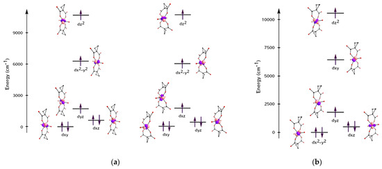 (a) Co2+ ion d-AO splitting in {Co1(cpdc)2(H2O)}2− (left) and {Co2(cpdc)2(H2O)}2− (right) anions in complex 1; (b) Co2+ ion d-AO splitting in [Co1(cpdc)2(H2O)]2− anion in complex 2.
