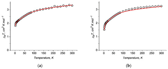 These values were then fixed to fit the dc magnetic properties in order to reduce the number of varied parameters in the GH to only two, namely, λ and κ [31]. By simultaneous fitting of the temperature dependence (Figure 4), we obtained the best-fit values: average λ = −175.5 cm−1, κ = 0.87, χtip = 1.84·10−3 cm3·K·mol−1, and zJ = 0 cm−1 for 1; and λ = −175.4 cm−1, κ = 1.03, χtip = 1.12·10−3 cm3·K·mol−1, and zJ = –0.051 cm−1 for 2. The calculation for 2 takes into account weak intermolecular interactions, which may be due to the closer arrangement of cobalt atoms in the crystal lattice compared to 1.