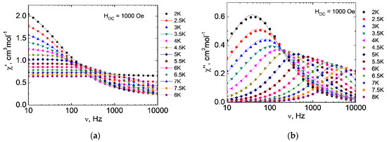 Recently, considerable attention has been paid to the slow magnetic relaxation of complexes of d-elements and especially Co2+; in other words, to their properties as molecular magnets [9,15,16,18,47]. In order to check the presence of slow magnetic relaxation for the complexes obtained, studies of the dynamic magnetic susceptibility of all the compounds were carried out (Figure 6 and Figure 7). As a result of these measurements, the frequency dependences of the real (in-phase, χ′) and imaginary (out-of-phase, χ″) components of magnetic susceptibility in magnetic fields from 0 to 5000 Oe at 2 K (Figures S3.1 and S3.2) were obtained.