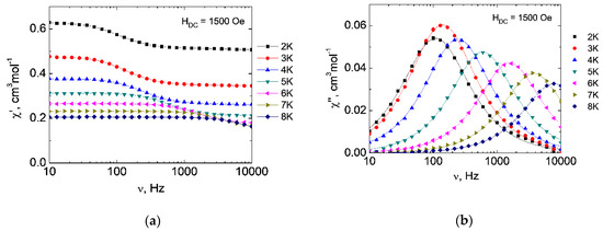 Applying an external magnetic field made it possible to study slow magnetic relaxation in 1 and 2. The optimal dc magnetic fields corresponding to the largest values of the relaxation time are 1000 Oe for 1 and 1500 Oe for 2 (Figures S3.1 and 3.2). The frequency dependences of the in-phase and out-of-phase signals were obtained in the optimal magnetic fields (Figure 6 and Figure 7). According to the results of the approximation of isotherms χ″(ν) using the generalized Debye model, the dependences of the relaxation time on inverse temperature τ(1/T) were obtained (Figure 8).
