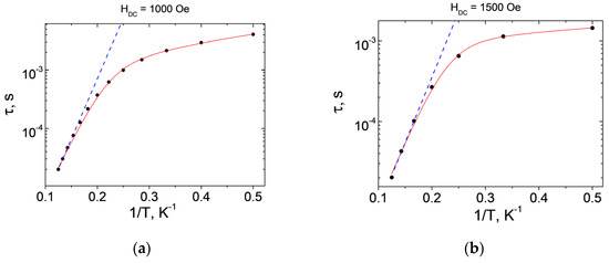 The τ(1/T) plots of the relaxation time of 1 (a) and 2 (b). Blue dashed lines—approximations of the high-temperature region using the Orbach relaxation mechanism; red solid lines—approximations using the sum of the Orbach and Raman mechanisms in the entire temperature range.