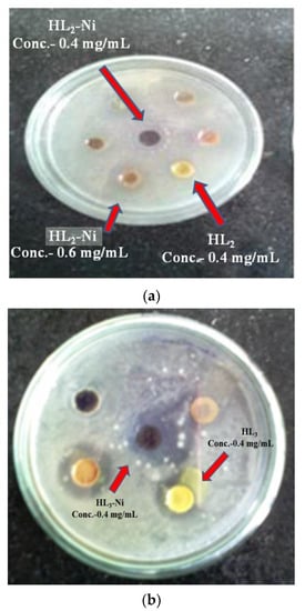 (a) Zone of inhibition of HL2 and HL2-Ni for Pseudomonas aeruginosa; (b) Zone of inhibition of HL3 and HL3 -Ni for Staphylococcus aureus.