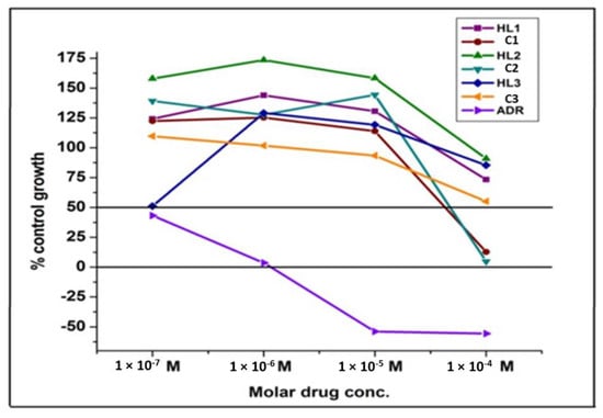 The growth curve of human ovarian cancer cell line OVCAR-3 for Schiff bases (HL1–HL3) and their Ni(II) complexes (C1–C3) is represented in Figure 4. All the synthesized compounds were screened for their anticancer activity against OVCAR-3 (ovary) cell line. The anticancer activity was measured in vitro for the newly synthesized Schiff bases (HL1–HL3) and Ni(II) complexes (C1–C3) using the Sulforhodamine B stain (SRB) assay method [97,98,99]. In the current protocol, each cell line is inoculated on a pre-incubated microtiter plate. The test agents are added at a single concentration and the culture is incubated for 48 h. The endpoint of determinations is made with Sulforhodamine B, a protein-binding dye. The results for each test agent are reported as the percentage growth of the tested cells. The average values for % control growth for the cell line OVCAR-3 are listed in Table 10.