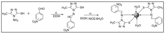 The coordination compounds of 1,2,4-triazoles have a considerable interest because of their brilliant coordination potential and diverse pharmacological properties [18,19,20,21,22,23,24,25,26]. The presence of an electron withdrawing group like -NO2 on aromatic ring showed improved antimicrobial activity [27,28]. Due to their rich and all around coordination mode, we applied some triazole derivatives for the determination of trace amounts of precious metals like Cu(II), Pd(II), Au(III), toxic metals like Se(IV), Te(V), Bi(III) and Cr(VI) [29,30,31,32,33,34,35]. There are also some known drugs containing 1,2,4-triazole moiety like Letrozole, Anastrozole [36], Trazodone [37,38]. Literature survey reveals that, no work has been reported on the synthesis of Ni(II) complexes derived from 4-amino-5-mercapto-3-methyl-1,2,4-triazole and 2/3/4-nitrobenzaldehyde. Recently, in 2017 we reported [38,39] the synthesis and characterization of a series of cobalt, nickel and copper complexes of bidentate Schiff base derived from the condensation reaction of 4-amino-5-mercapto-3-methyl-1,2,4-triazole with 2-nitrobenzaldehyde and their utilization as an anticancer agent. Interestingly, it was found that Schiff base and its Co(II), Ni(II) and Cu(II) complexes exhibit excellent activity against breast cancer cell line MCF-7. Such results prompted us to design new compounds and aiming to get new anticancer agents.