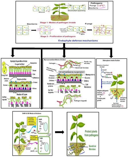 Plants nurture many microorganisms in the phyllosphere and rhizosphere. In 1886, German botanist Anton de Bary, the father of plant pathology, proposed the term endophyte [15]. Endophytes are ubiquitous and reside in the intercellular tissues of about 300,000 plant species without causing any negative impacts [16]. Some predominant prokaryotic and eukaryotic endophytes that have been explored are Actinobacteria, Ascomycota, Bacteroidetes, Basidiomycota, Firmicutes, Proteobacteria, and Zygomycota [17]. Endophytes produce several secondary metabolites, enzymes, and hormones that have a vital role in biotechnology. Endophytes′ antagonistic effect and antimicrobial activities prevent the plants from pathogen infection [18]. Thus, the various plant–endophyte interactions have captivated researchers in sustaining the agroindustries. This review encapsulates the fungal- and bacterial-induced stress in plants such as water and nutrient deficiency stress that causes various plant diseases. It also explores the significant role of stress-tolerant fungal and bacterial endophytes, and their biocontrol defense mechanisms such as the production of hydrolytic enzymes, secondary metabolites, siderophores, systemic acquired resistance (SAR), and induced systemic resistance (ISR) in combating fungal and bacterial pathogens.