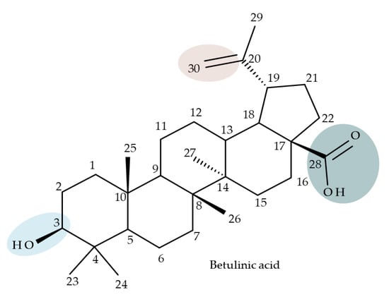 - Oliveira-Costa, J.F.; Meira, C.S.; das Neves, M.V.G.; Dos Reis, B.P.Z.C.; Soares, M.B.P. Anti-Inflammatory Activities of Betulinic Acid: A Review. Front. Pharmacol. 2022, 13, 883857. [Google Scholar] [CrossRef] [PubMed]