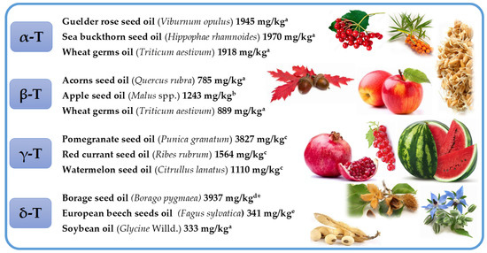 Selected richest sources of four tocopherol (T) homologues (α, β, γ, and δ). * Concentration of tocopherols was calculated as α-tocopheryl acetate equivalents. Superscripts (a–e) refers to the following literature positions: a, [12]; b, [42]; c, [35]; d, [46]; e, [47].