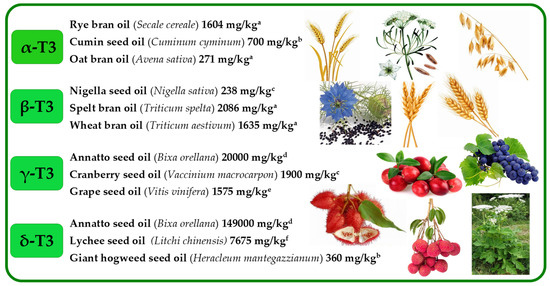 Selected richest sources of four tocotrienol (T3) homologues (α, β, γ, and δ). Superscripts (a–f) refers to the following literature positions: a, [38]; b, [50]; c, [12]; d, [54]; e, [57]; f, [63].