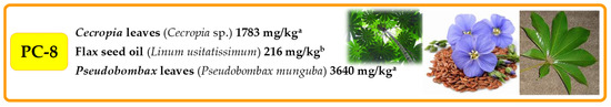 PC-8 is found in the seeds and oils of various species belonging to different families [36,63,65]. The oils richest in PC-8 are Linum usitatissimum [65], which is often used for PC-8 isolation [12,13], and Erythrophleum fordii [63]. PC-8 is present in different plant organs [61,66], especially leaves of both eudicots, e.g., Pseudobombax munguba [65], and monocots, e.g., Zea mays [67]. The content of PC-8 in leaves depends on the species and the stage of development [30,61,66,68] (Figure 7, Table S9 in Supplementary Materials).