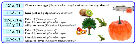 Sources of tocomonoenols (T1s). Superscripts (a–f) refers to the following literature positions: a, [70]; b, [71]; c, [75]; d, [73]; e, [16]; f, [74].