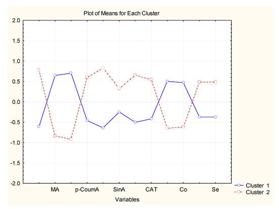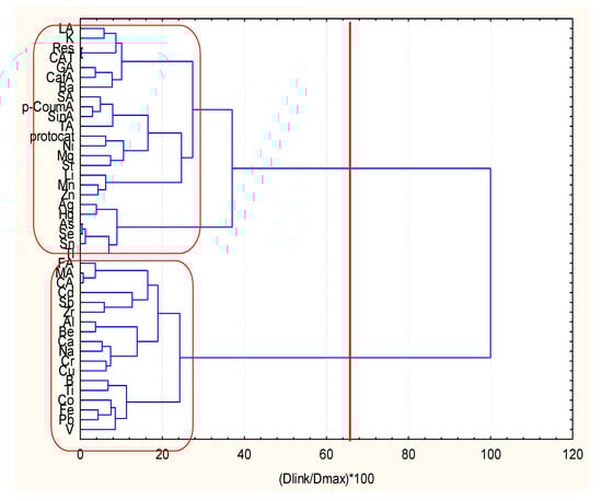 From all the available variables, one could select 12 as possible descriptors for the easy and reliable partitioning of the 23 wine objects: LA, MA, CA, p-CoumA, GA, SinA, Res, CAT, Ca, Co, K and Se. Most of the chosen descriptors are organic compounds, but there are also 4 metal descriptors obviously related to the soil specificity. When using only these 12 descriptors, one could reach a very good partitioning between the objects (Figure 4). Two groups (classes) are well-separated by the difference of the concentration levels of the 12 descriptors. Again, one of the clusters formed using only 12 variables is the class of red wine (cluster 2) and the other one—that of white wines (cluster 1).