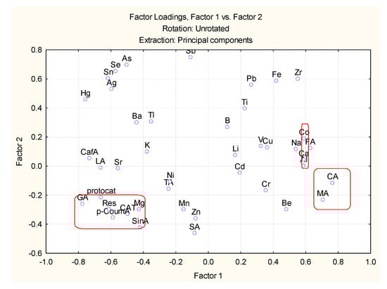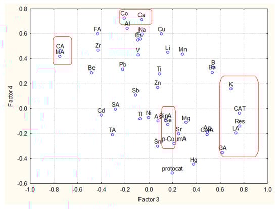 The variables with high factor loadings with respect to factor 3 and factor 4 are K, CAT, LA, Res, GA, CA and MA. The other two marked groups, Co and Ca, and SinA and p-CoumA, do not indicate high loadings to factors 3 and 4, but as seen in Figure 3 they show high loadings with respect to factors 1 and 2.