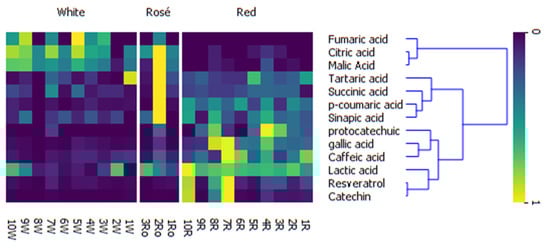 Heat map combined with hierarchical clustering with averaged linkage showing the difference in concentration of selected organic compounds and polyphenols in samples of white, red and rosé wines.